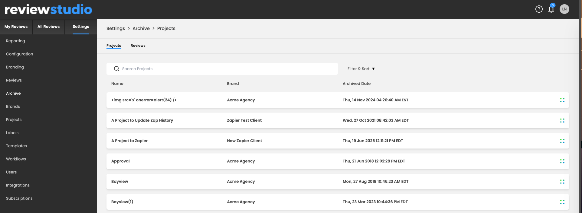 Under Settings > Archive, you will have the option to view either archived Projects or archived Reviews. To view archived Reviews, simply choose the Reviews option in Settings > Archive. Archived Reviews will display the Review name, applied categorizations, and the archival date.