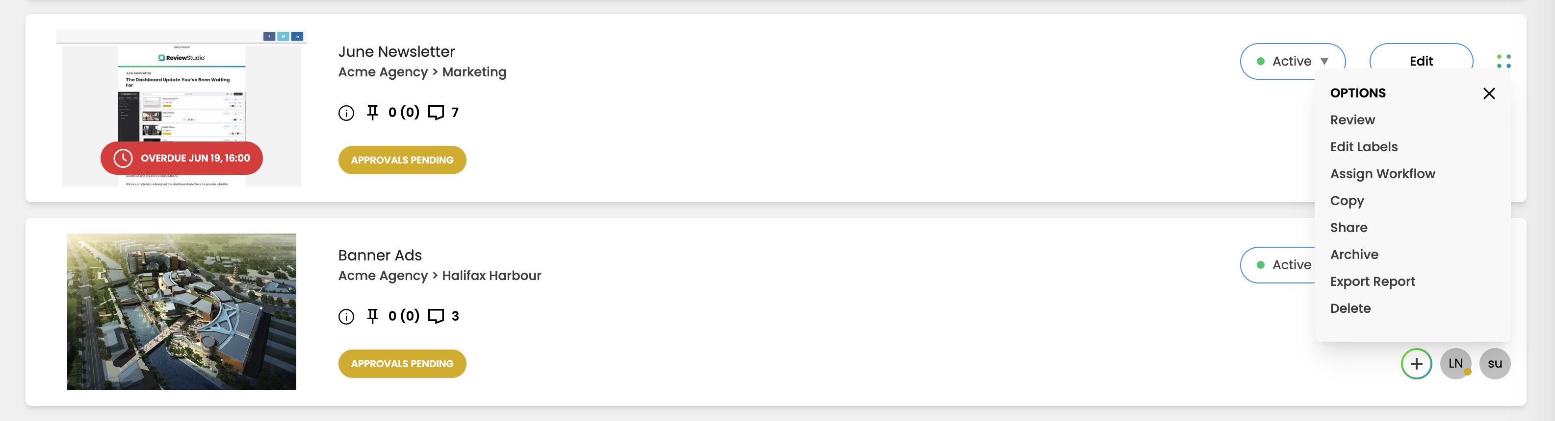 To archive a Review, find the Review card in your Dashboard and click the 4-dot icon. Choose “Archive” from the drop-down menu.