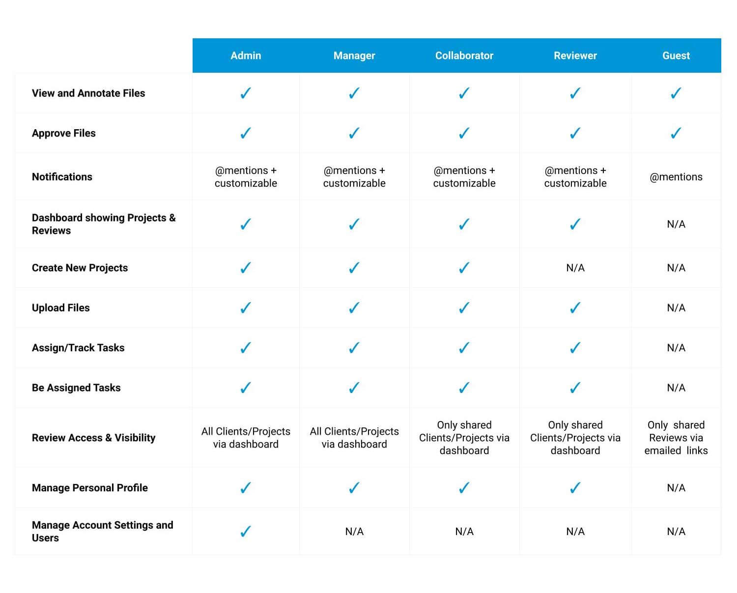 Managers are very similar to Admins; except they don’t have access to certain account settings. Managers can access and manage all Reviews, add users to Reviews, create new clients and projects and more. What they can’t do is modify the account configuration settings, create new users, and manage billing.