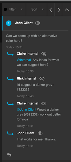 Now, any feedback, comments, approvals, or tasks added to the Review will now only be visible to the appropriate people. As a visual cue to the Internal team members, all comments and replies will display an icon that represents their internal (private) or external (visible) status.