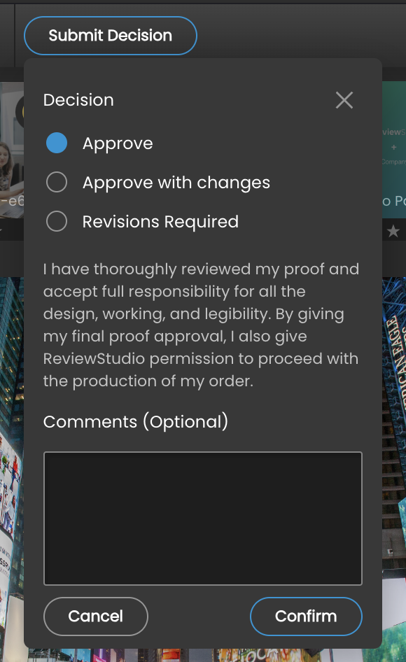 If you have been designated as an Approver in a Review, you will see a Submit Decision button in the top menu bar. A different decision may be submitted for each file that is included in the Review.
