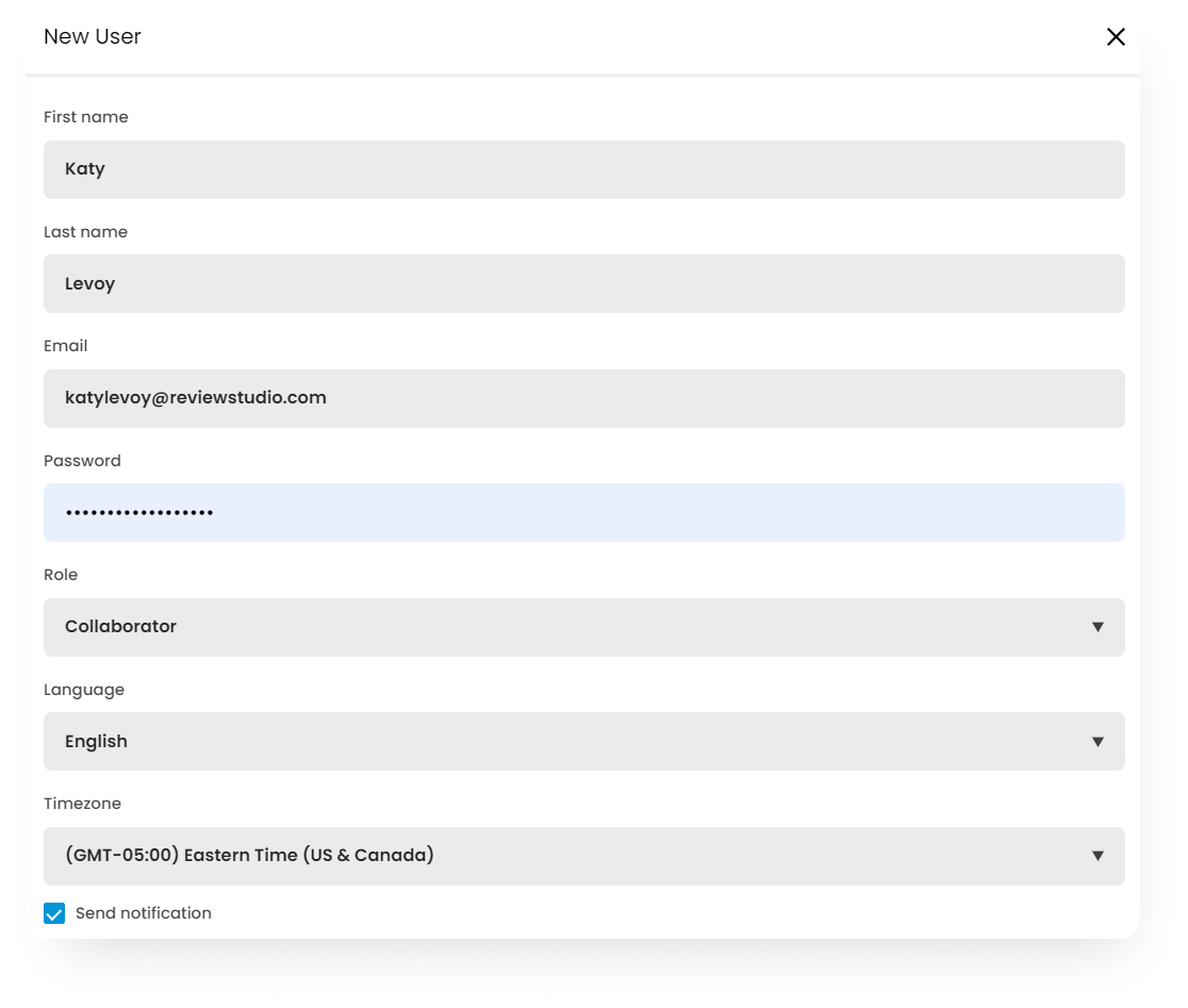 Check Send Notification if you want to send the new user a notification of the new account credentials. They will receive a branded message informing them of their new account with instructions for changing their password.