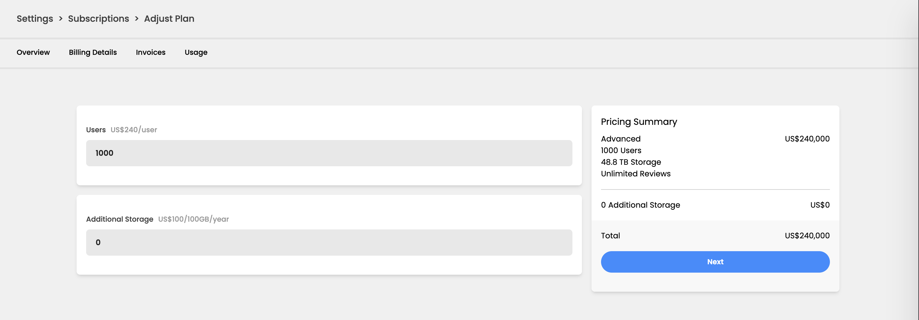 To add additional storage to a plan, go to Settings > Subscriptions > Overview