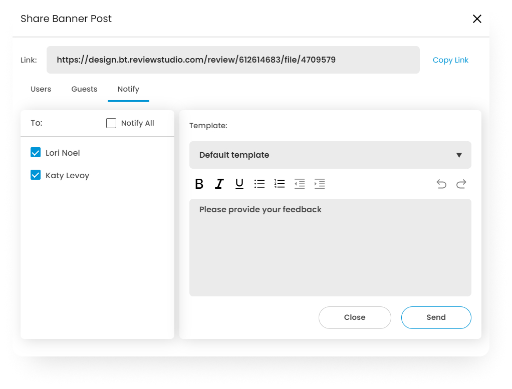 In order to facilitate and standardize the creation of these messages, ReviewStudio provides a feature for you to create Templates of all the various messages you may send. When you send a new notification, you can then simply select the desired message from your template list to automatically include it within your notification.