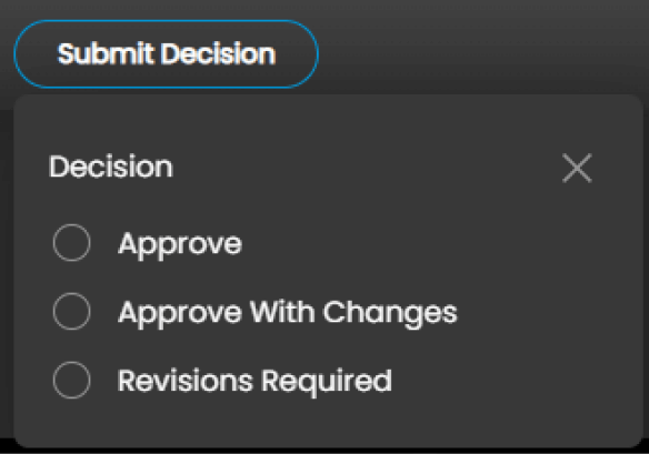 Once you’ve gone through your Review, if you are designated as an Approver you will see the Submit Decision menu. Clicking it will provide you with approval options that may have been customized by your account admin.
