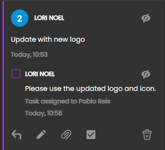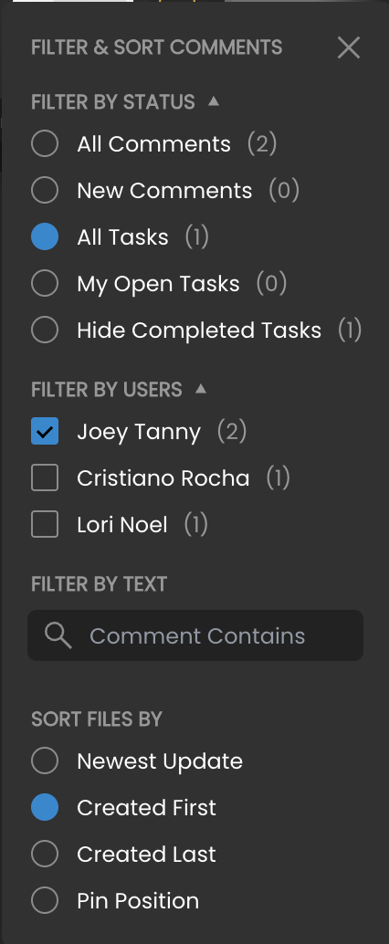 Filter by Task Assignment - The option to filter the comment bar by a specific user shows comments initiated by a specific user, as well as any comments where that user replies, is @mentioned, created tasks, or has tasks assigned to them.