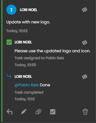 Note that another user with access can also complete the task. The Task comment will indicate which user completed the task, and allow the user to leave a comment, tag another user, or add an additional task to the thread.
