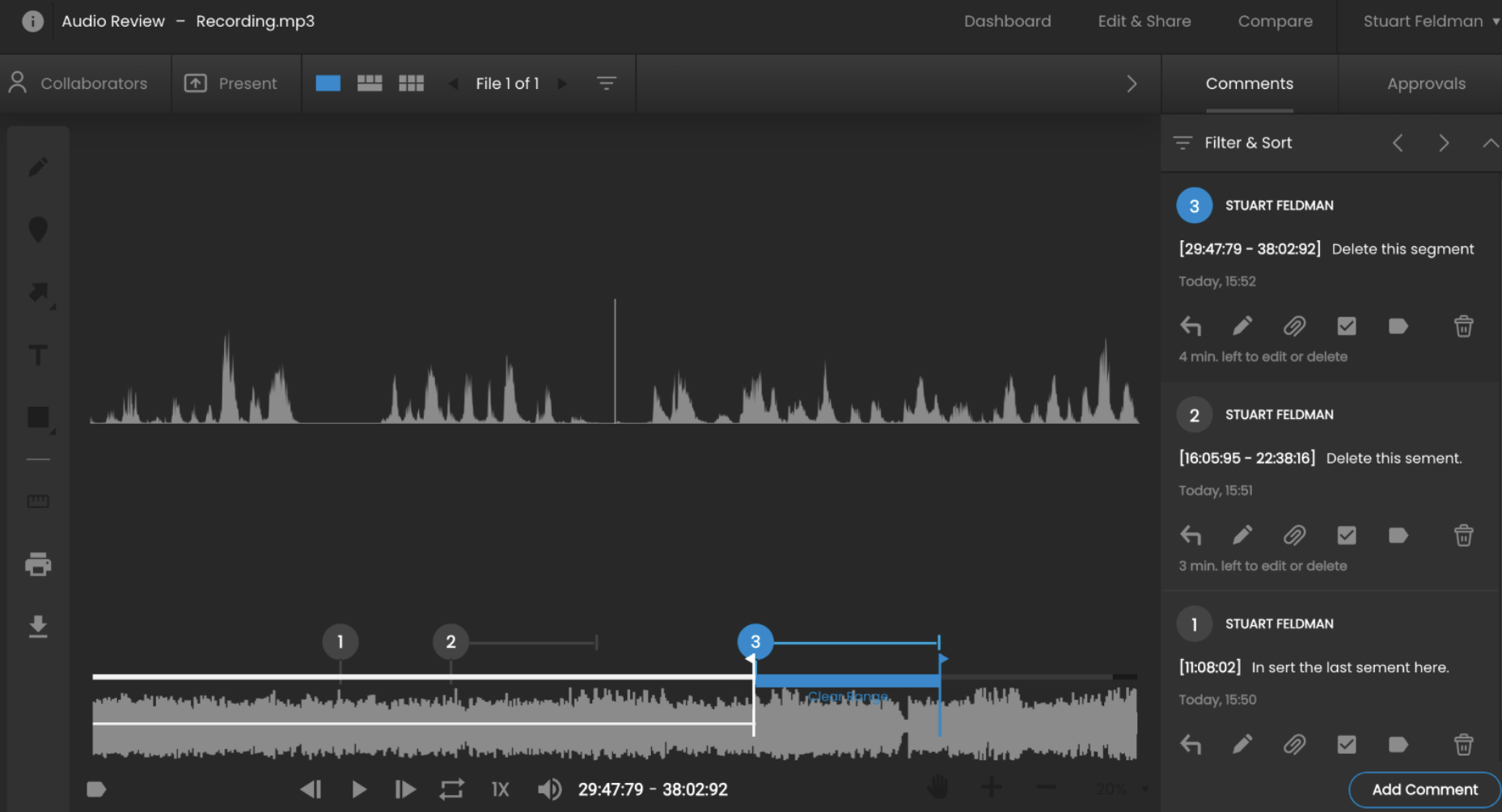 As with video, it is also possible to add a comment that relates to a specific segment of the audio track. Pause the video playback at the start of the segment you want to comment on. Then split the playhead and drag each half to the start and end of the segment you want to comment on (you can also “nudge” each half of the playhead for more precision). The marker will show the start and end point the associated comment relates to.